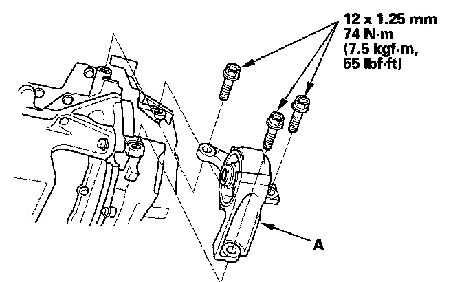 13. Install the front engine mount bracket (A) on the transmission and engine.