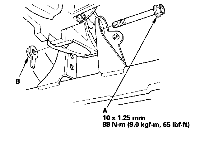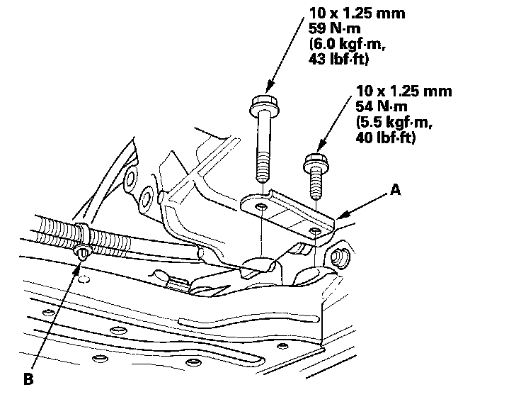 19. Install the transmission mount bracket, (A) and connect the ground cable (B).