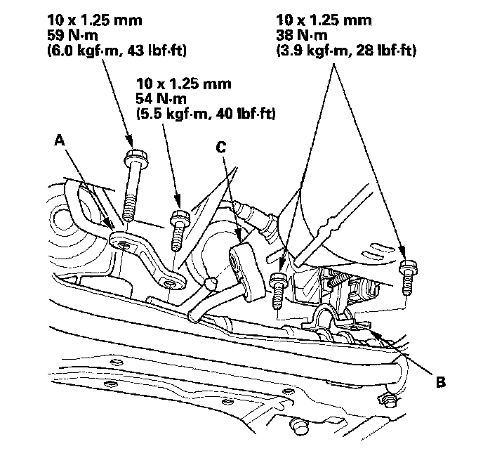 17. Install the stiffener plate (A) and mounting bracket (B). Tighten the mounting bolts. Connect the rubber exhaust hanger (C).