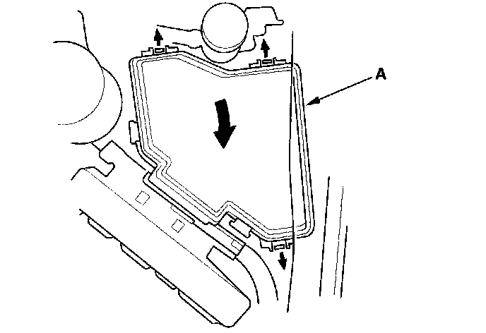25. Install the under-food fuse/relay box (A) on the under-hood fuse/relay bracket.