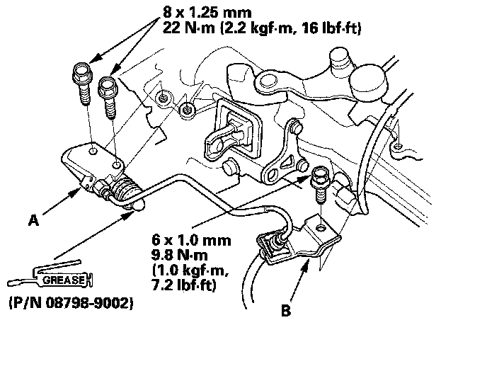 33. Apply super high temp urea grease (P/N 08798-9002) to the end of the cylinder rod. Install the slave cylinder (A) then install the clutch line bracket (B). Be careful not to bend the clutch line.