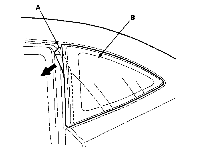 3. Remove the front seal (A) from the front edge of the quarter glass (B). If necessary, cut the front seal with a utility knife.
