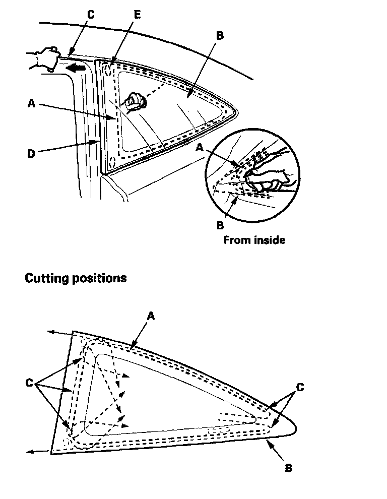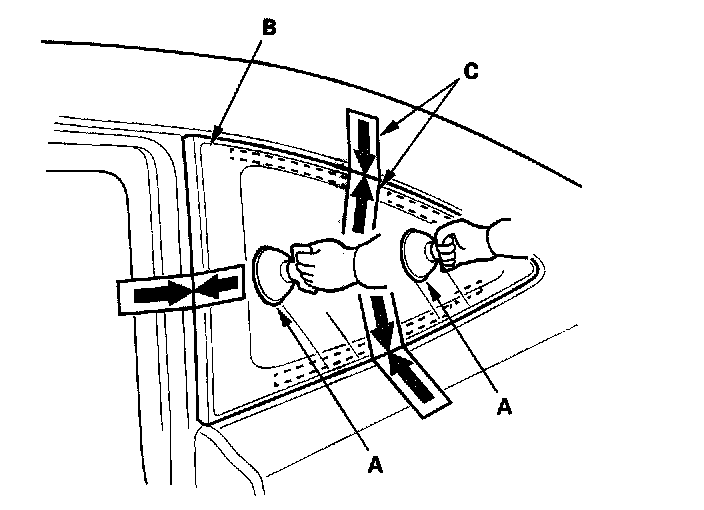 4. Carefully cut through the adhesive (A) at the rear corner portion of the quarter glass (B) with a utility knife. With a helper on the outside, pull the piano wire (C) back and forth in a sawing motion. Hold the piano wire as close to the quarter glass as possible to prevent damage to the body, and carefully cut through the adhesive around the entire quarter glass:
