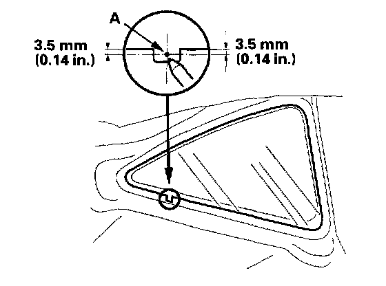 9. Set the quarter glass in the opening. Make an alignment mark (A) to the quarter glass with a grease pencil as shown where the clip will be installed.