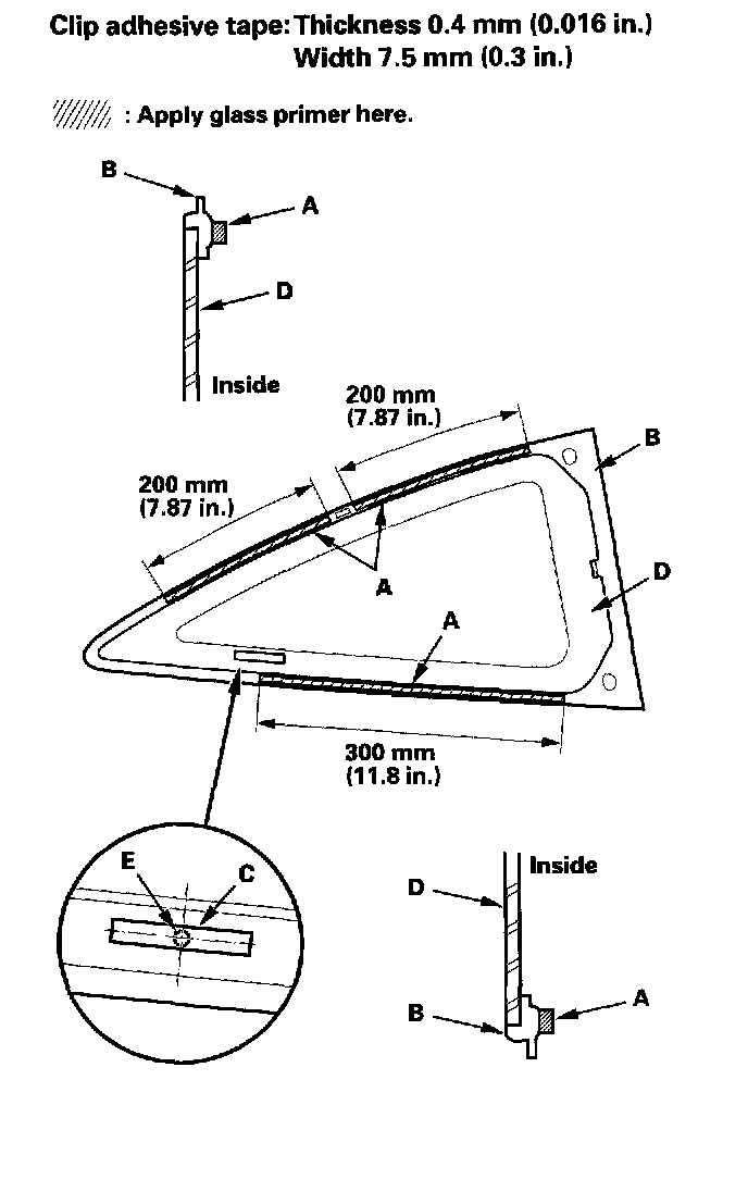 - With the printed dots (C) on the quarter glass (D) as a guide, apply the glass primer to the front portion of the quarter glass.