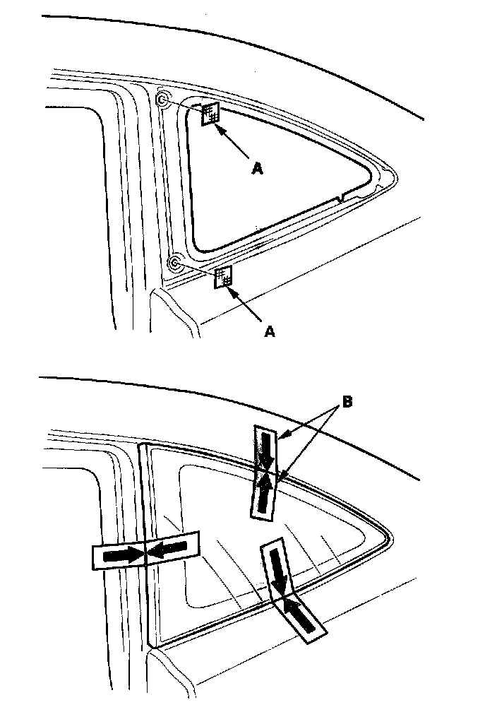 13. If the old quarter glass will be reinstalled (and either clip is broken off the molding), seal the body holes with pieces of urethane tape (A). Then set the quarter glass upright in the opening, and make alignment marks (B) across the quarter glass and body with a grease pencil at the three points shown. Be careful not to touch the quarter glass where adhesive will be applied.