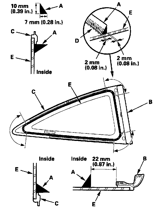 18. Pack adhesive into the cartridge without air pockets to ensure continuous delivery. Put the cartridge in a caulking gun, and run a bead of adhesive (A) around the edge of the front seal (B) and molding (C) as shown. With the glass primer (D) you applied in step 15 on the quarter glass (E) as a guide, apply the adhesive to the upper and lower corner portions of the quarter glass. Apply the adhesive within 30 minutes after applying the glass primer. Make a slightly thicker bead at each corner.