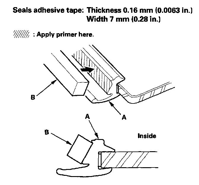 13. Apply primer to the molding (A), then attach the molding upper seal (B) with adhesive tape to the inside surface of the molding as shown.
