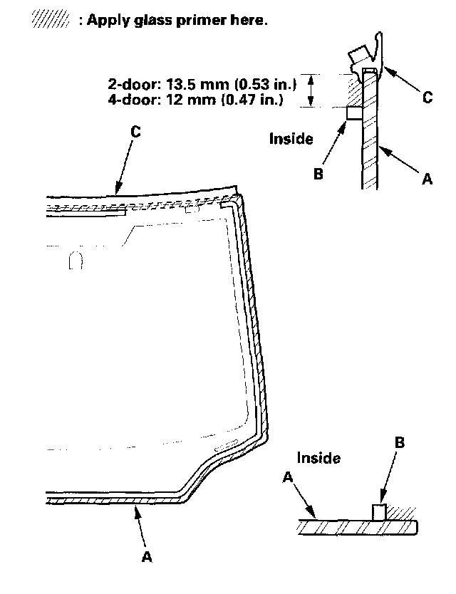17. With a sponge, apply a light coat of glass primer around the edge of the windshield (A) between the dams (B) and molding (C) as shown, then lightly wipe it off with gauze or cheesecloth: