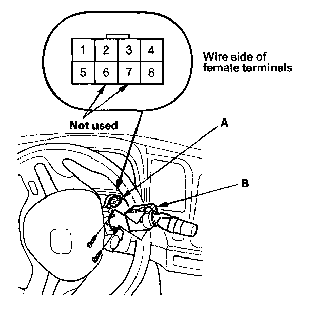 2. Disconnect the dashboard wire harness 8P connector (A) from the wiper/washer switch (B).