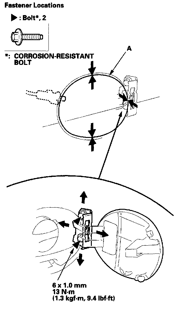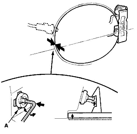 2. Adjust the fuel fill door (A) in or out until it's flush with the body, and up or down as necessary to equalize the gaps.