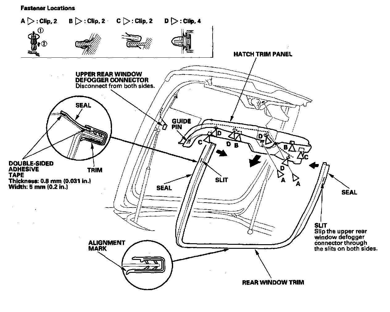 - Locate the painted alignment mark on the rear window trim. Align the painted mark with the alignment tab in the center of the hatch, and install the trim all the way around facing in the direction shown.