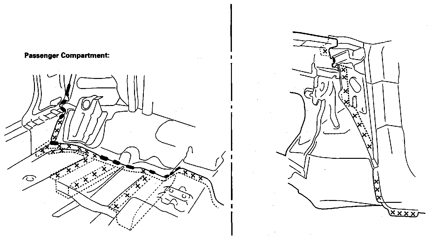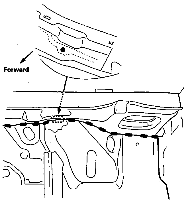 - Drill holes completely through the parts since the replacement front bulkhead-side frame assembly will be attached by plug welding.