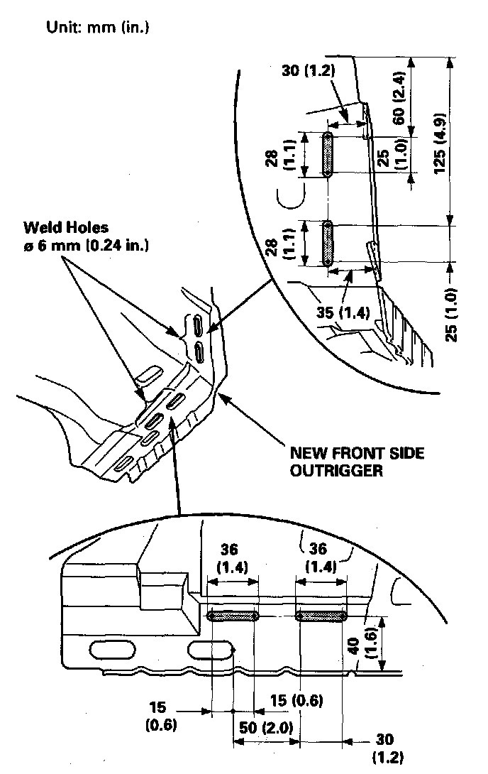 - Cut and pry off the front side outrigger and grind the fillet welds of the front inner lower pillar and front side outrigger.