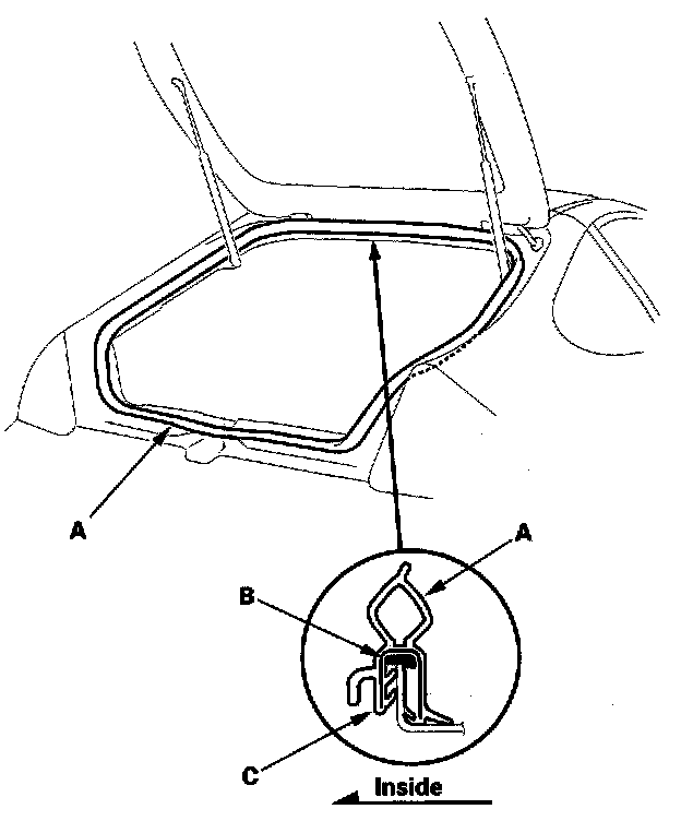 4. Locate the painted alignment mark (C) on the hatch weatherstrip. Align the painted mark with the alignment tab in the center of the hatch opening, and install the weatherstrip all the way around in the direction shown. Make sure there are no wrinkles in the weatherstrip.