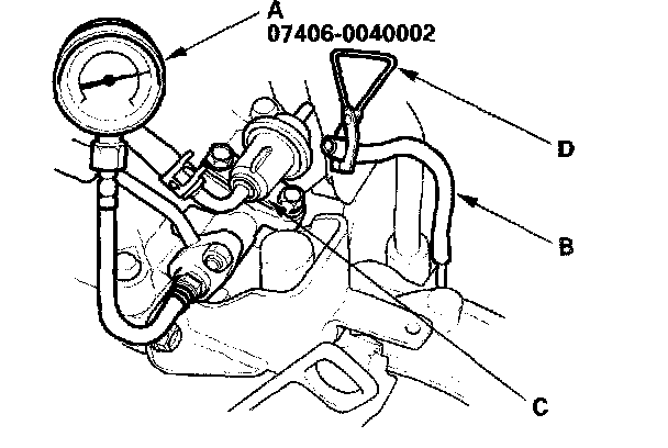 3. Disconnect the vacuum hose (B) from the fuel pressure regulator (C), and pinch it closed with a clamp (D).