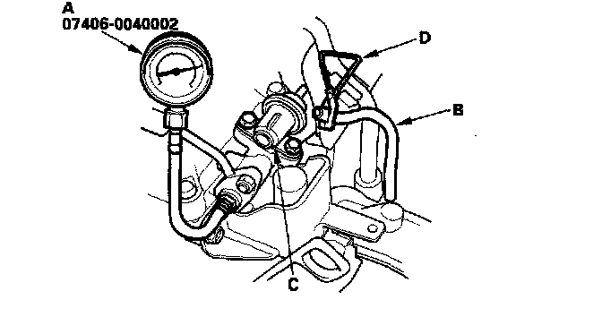 3. Remove the vacuum hose (B) from the fuel pulsation damper (C), and pinch off the hose with a clamp (D).