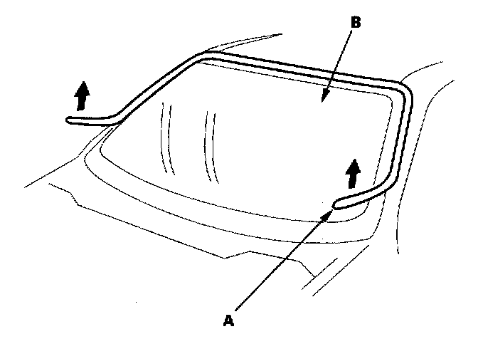 7. With a helper on the outside, pull the piano wire (A) back and forth in a sawing motion. Hold the piano wire as close to the glass as possible to prevent damage to the body and related parts. Carefully cut through the rubber dam and adhesive around the entire glass.