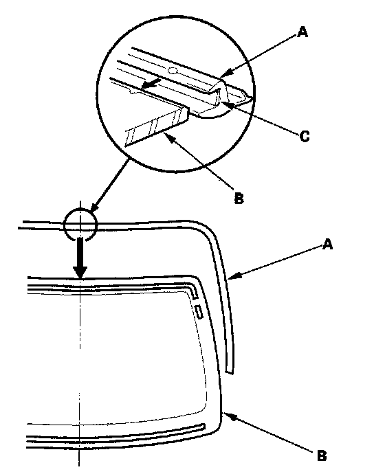 2. If necessary remove the molding (A) from the edge of the glass (B). If necessary, cut the molding with a utility knife. If the molding is part of the glass, take care not to damage the molding.