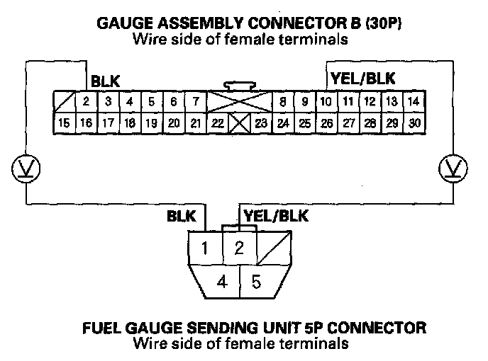 6. Without disconnecting the gauge assembly or fuel gauge sending unit connector, check for voltage between gauge assembly connector B (30P) No. 10 terminal and fuel gauge sending unit 5P connector No. 2 terminal, and between gauge assembly connector B (30P) No. 2 terminal and fuel gauge sending unit 5P connector No. 1 terminal.