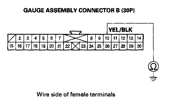 14. Check for continuity between gauge assembly connector B (30P) No. 10 terminal and body ground.