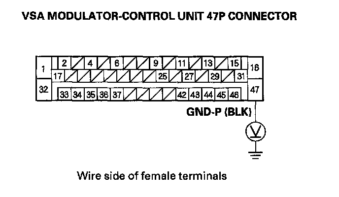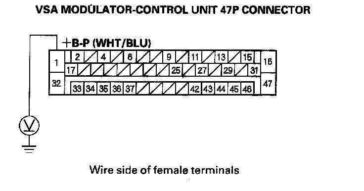 4. Measure the voltage between the VSA modulator control unit 47P connector terminal No. 1 and body ground.