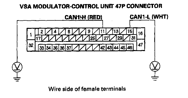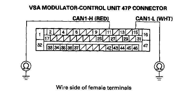 14. Check for continuity between body ground and the VSA modulator-control unit 47P connector terminal No. 11 and No. 15 individually.