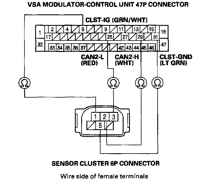 13. Check for continuity between the VSA modulator control unit 47P connector terminals No. 6, No. 25, No. 29, No. 31 and the sensor cluster 6P connector terminals No. 1, No. 3, No. 2, No. 5.