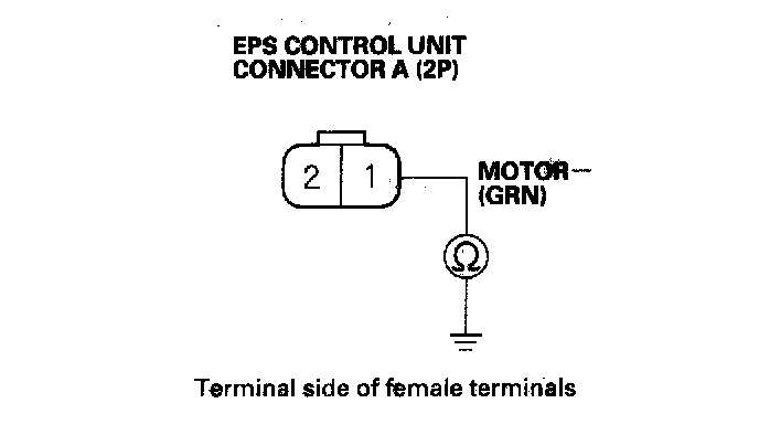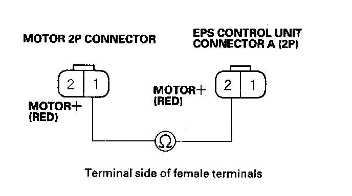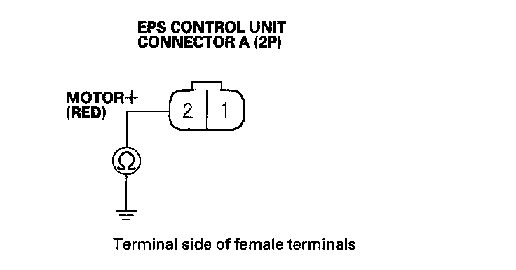 5. Check for continuity between EPS control unit connector A (2P) terminal No. 1 and motor 2P connector terminal No. 2.