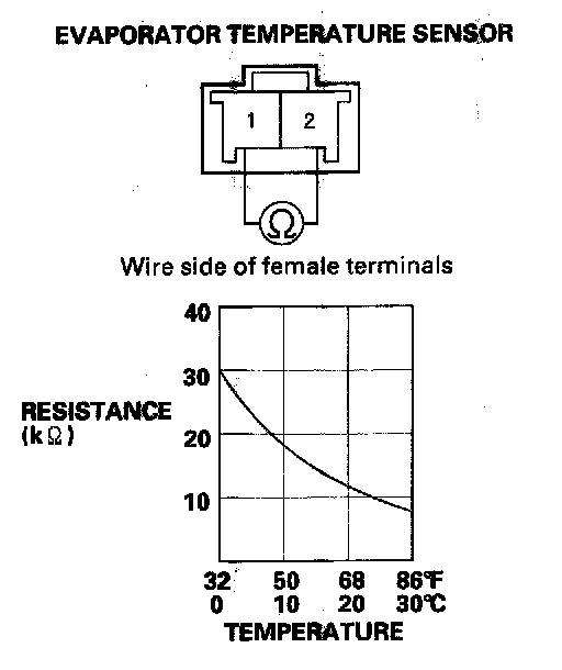 2. Measure the resistance between the No. 1 and No. 2 terminals of the evaporator temperature sensor.