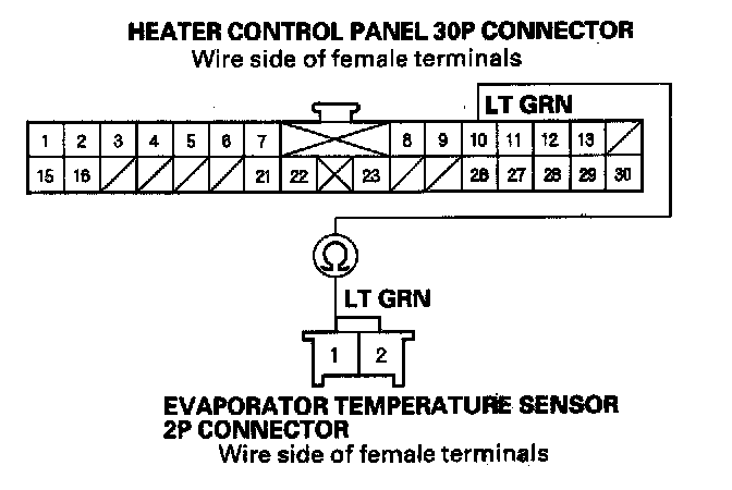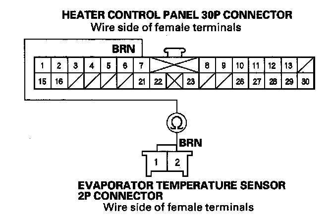 5. Check for continuity between the No. 7 terminal of the heater control panel 30P connector and the No. 2 terminal of the evaporator temperature sensor 2P connector.