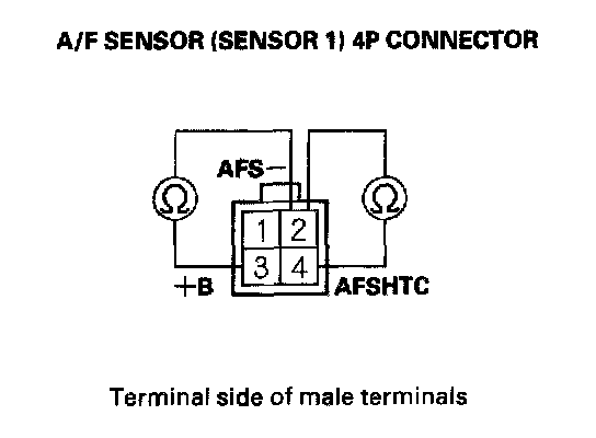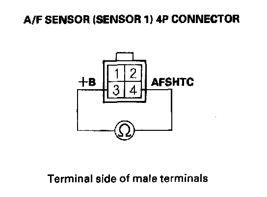 8. At the A/F sensor side, measure resistance between A/F sensor (Sensor 1) 4P connector terminals No. 3 and No. 4.