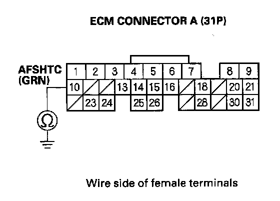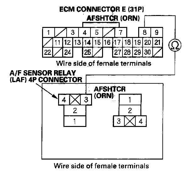 20. Check for continuity between ECM connector terminal E8 and A/F sensor relay (LAF) 4P connector terminal No. 3.