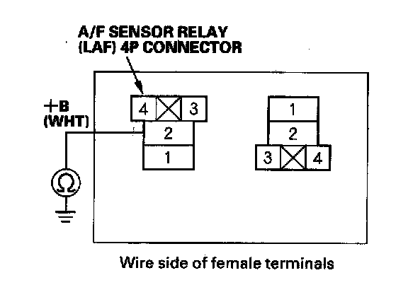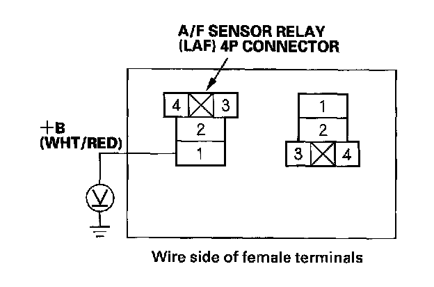21. Measure voltage between A/F sensor relay (LAF) 4P connector terminal No. 1 and body ground.