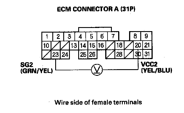 7. Measure voltage between ECM connector terminals A20 and A23.