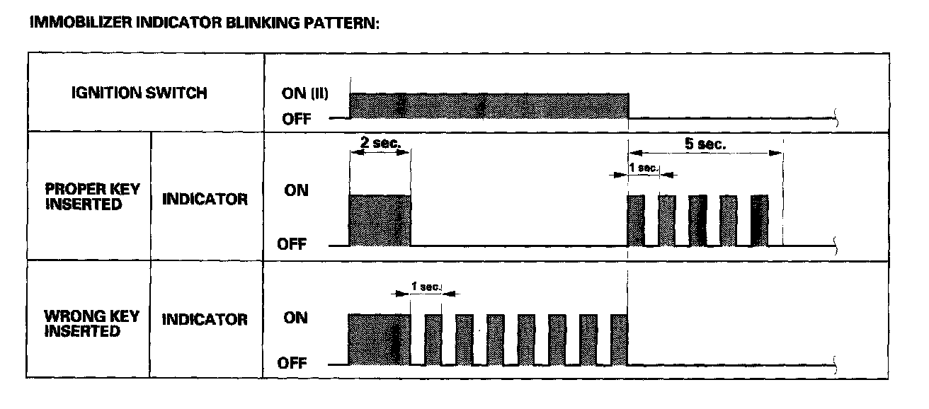 - If the proper key has been used, the immobilizer indicator will come on for about 2 seconds, then go off. When the ignition switch is turned OFF, the indicator will blink for about 5 seconds to signal that the unit has reset correctly, then the indicator will go off.