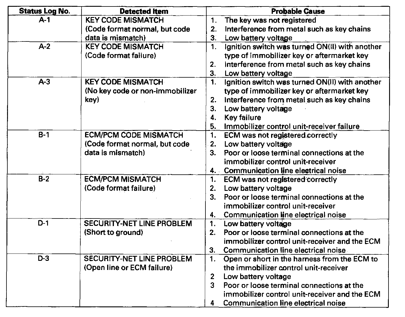 4. Check the Status log count. Troubleshoot the status with the highest count first. If no counts are listed, the immobilizer system is OK. Continue with normal symptom troubleshooting.