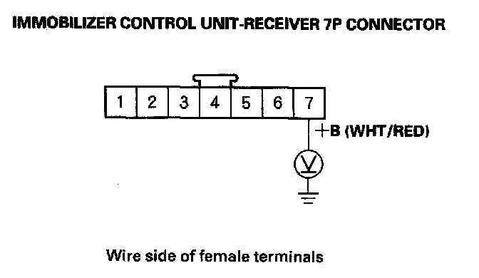 15. Check for voltage between the immobilizer control unit-receiver 7P connector No. 7 (+B) terminal and body ground.