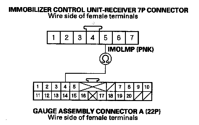 18. Check for continuity between the immobilizer control unit-receiver 7P connector No. 5 (IMOLMP) terminal and gauge assembly connector A (22P) No. 4 terminal.