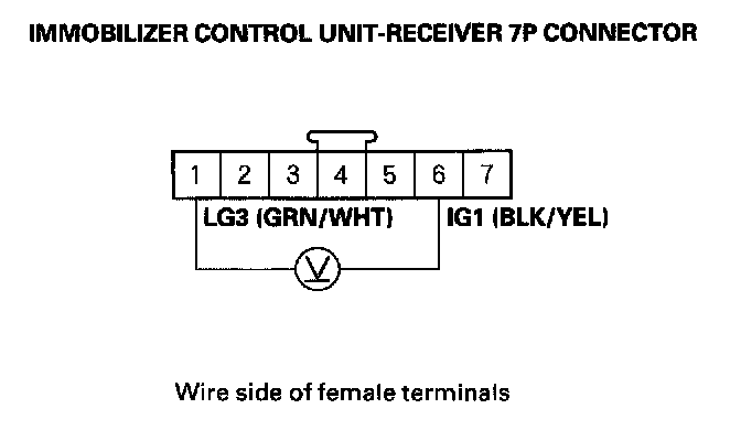 23. Check for voltage between the immobilizer control unit-receiver 7P connector No. 1 (LG3) and No. 6 (IG1) terminals.