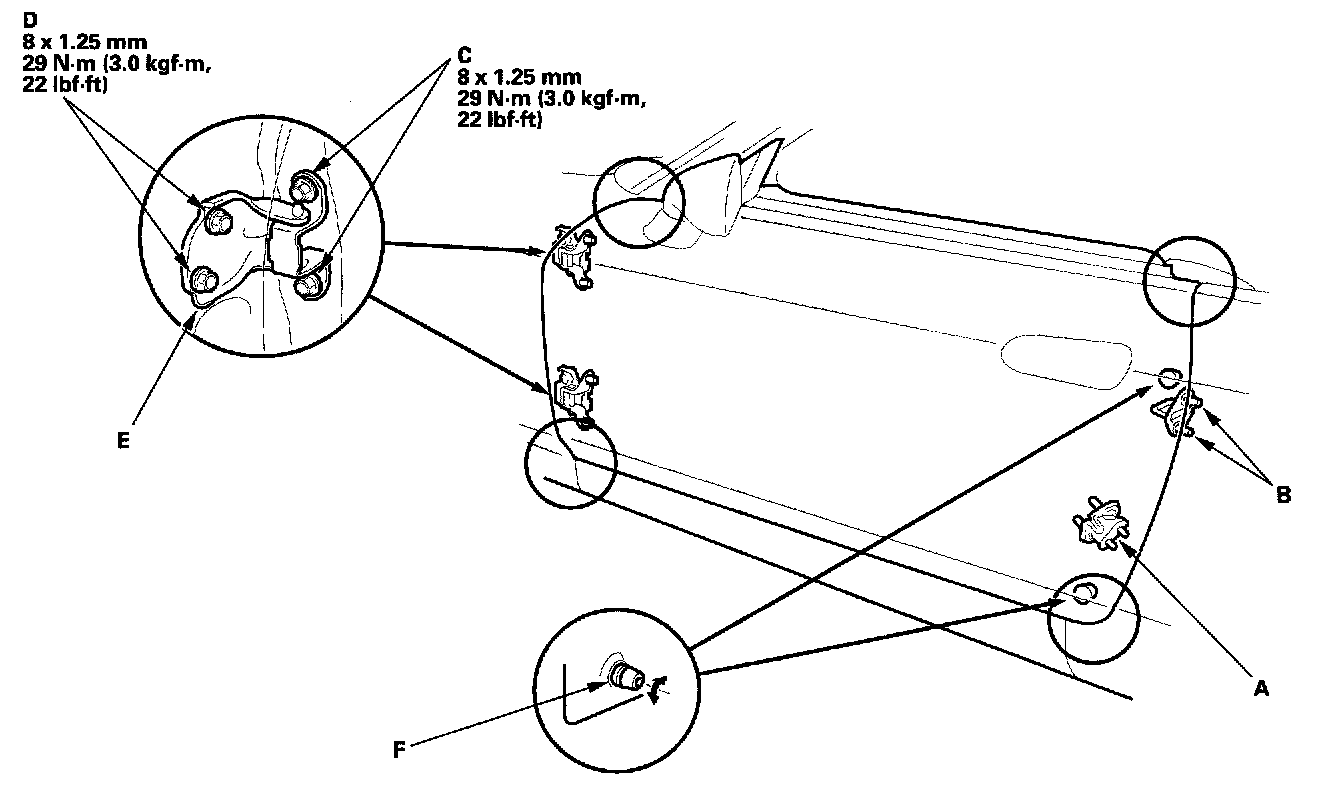 3. If necessary, replace the door mounting bolts (C) and hinge mounting bolts (D) with adjusting bolts (P/N 90101-SZ3-000) made specifically for door adjustment.
