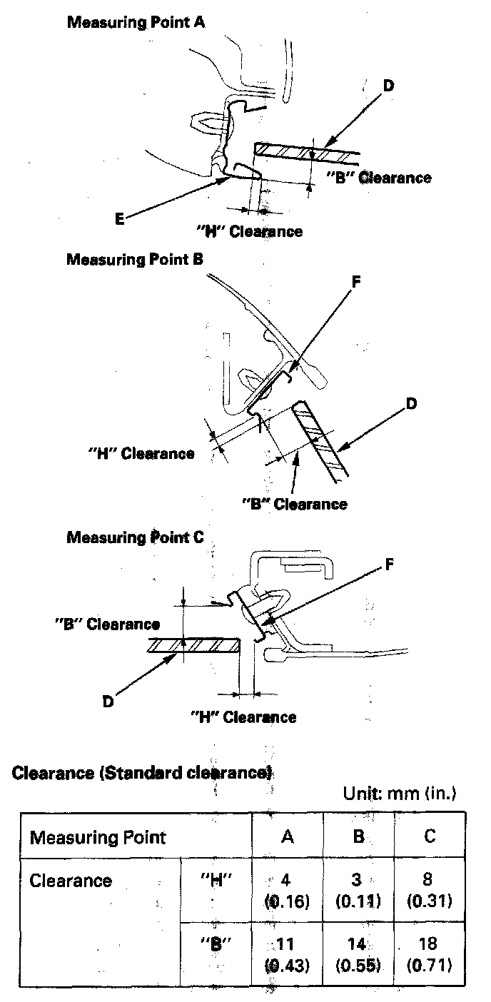 7. At the measuring points (A, B, C), measure and record clearances "H" and "B" between the glass (D) and the molding (E) and the glass and the retainer (F). Adjust the clearance as described in steps 9 thru 10.