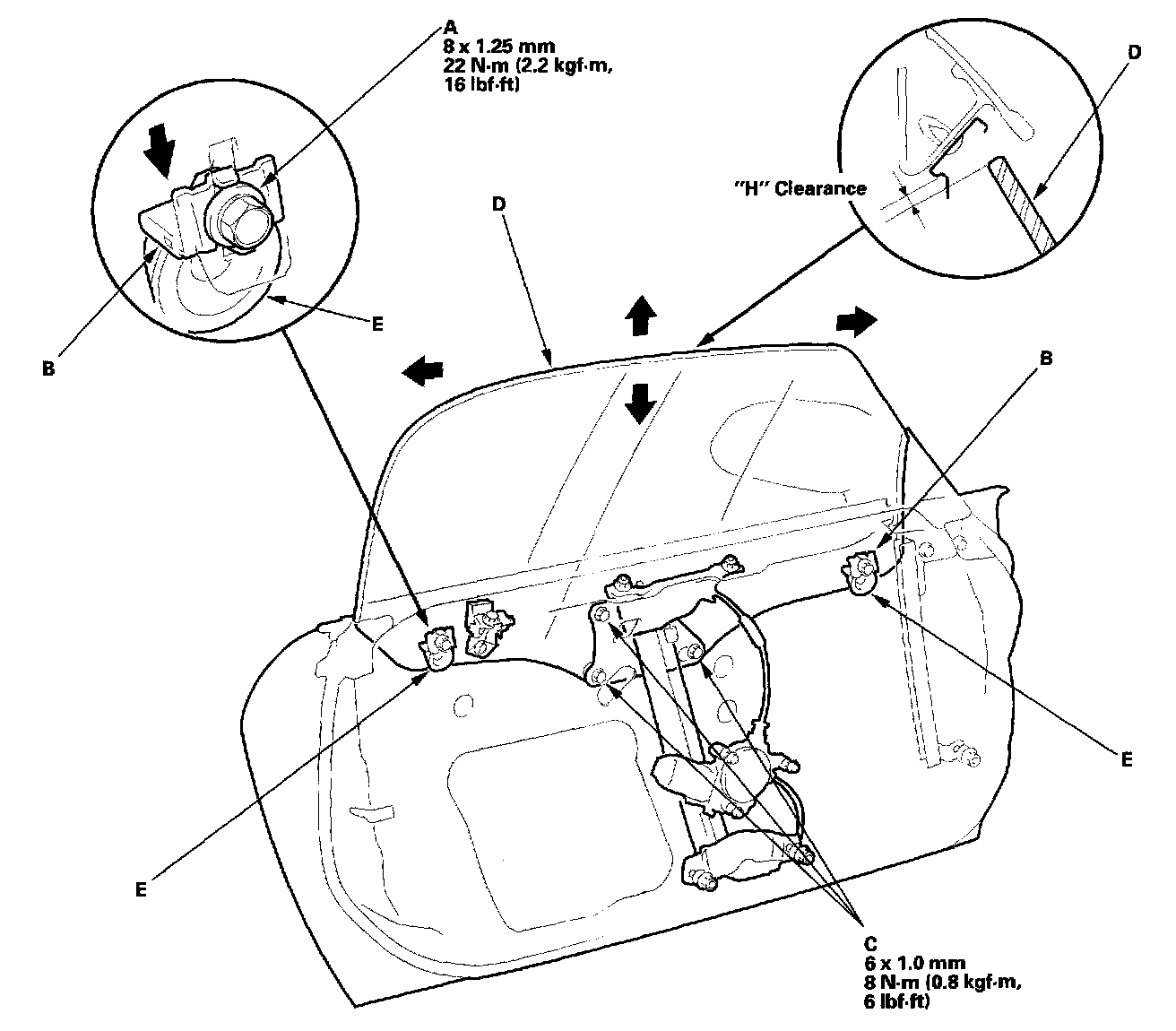4. Turn the adjusting bolts (E) until the clearance "B" is within the specified limits. Turn the front and rear adjusting bolts the same amount to keep the regulator (F) parallel with the seating surface of the door.