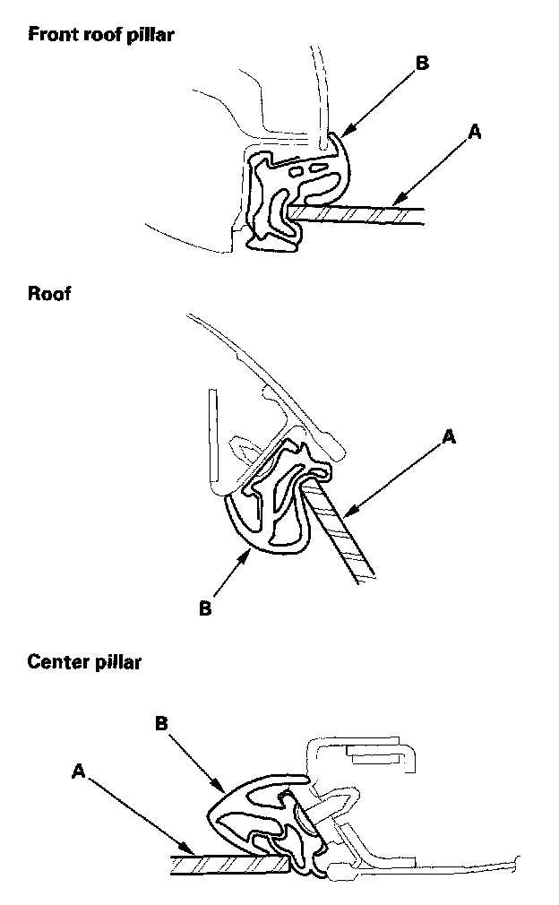 - Check the A-pillar-header weatherstrip, roof weatherstrips and B-pillar weatherstrip for damage or deterioration, and replace them if necessary.