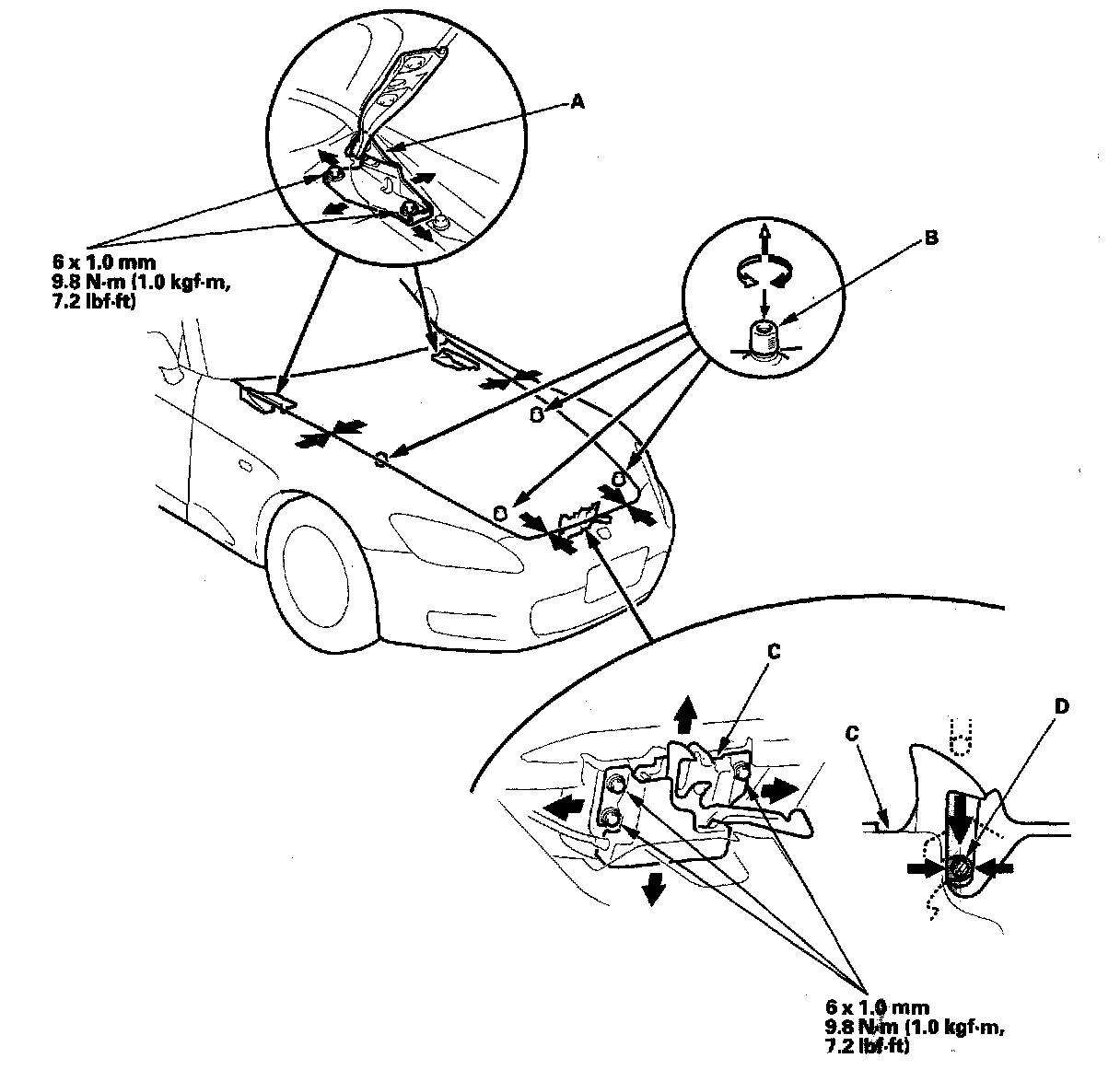 3. Adjust the hood latch (C) to obtain the proper height at the forward edge, and move the hood latch right or left until the striker (D) is centered in the hood latch.