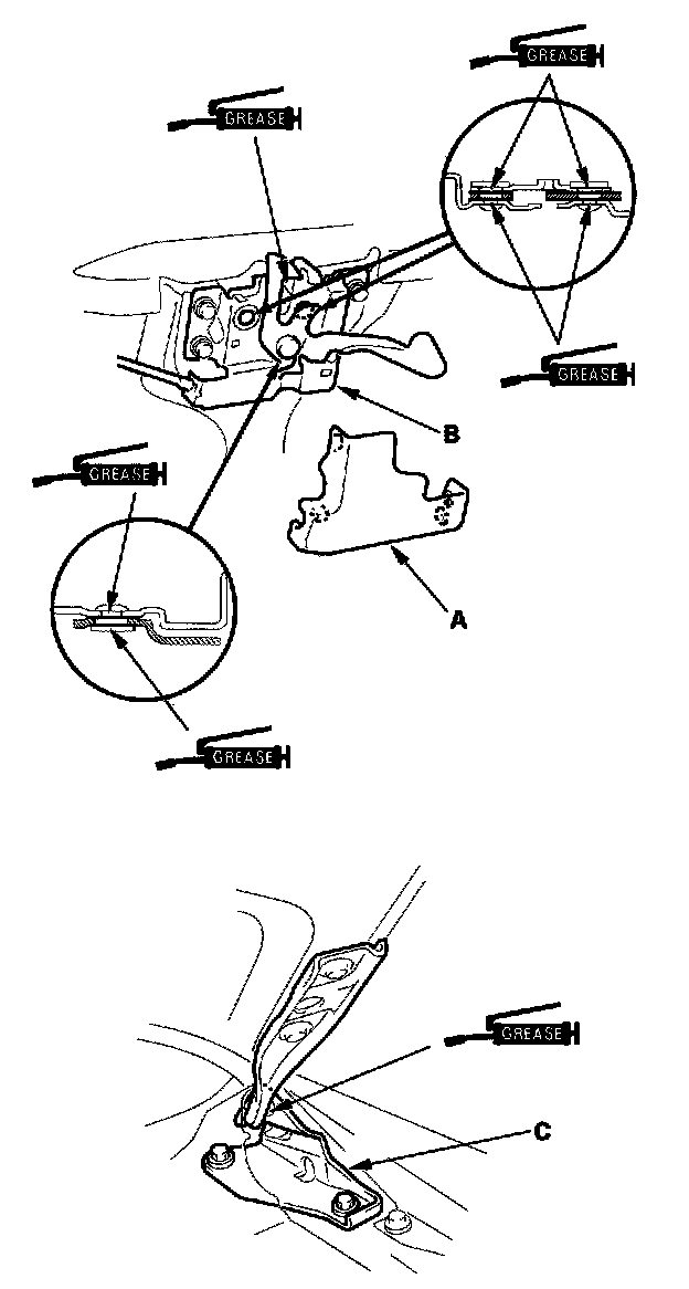 7. Remove the air guide plate cover, then remove the latch cover (A). Apply multipurpose grease to each location of the hood latch (B) and hood hinge (C) as indicated by the arrows.