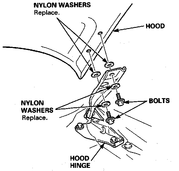 2. The hood mounting bolts are special "Dacro" type bolts, when replacing, use only the same type of bolts.