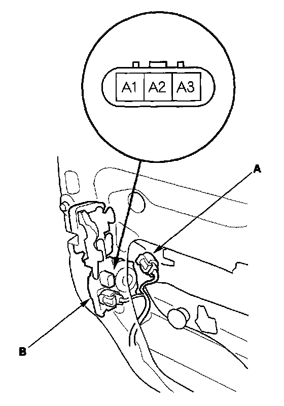 2. Disconnect the 3P connector (A) from the driver's door lock actuator (B).