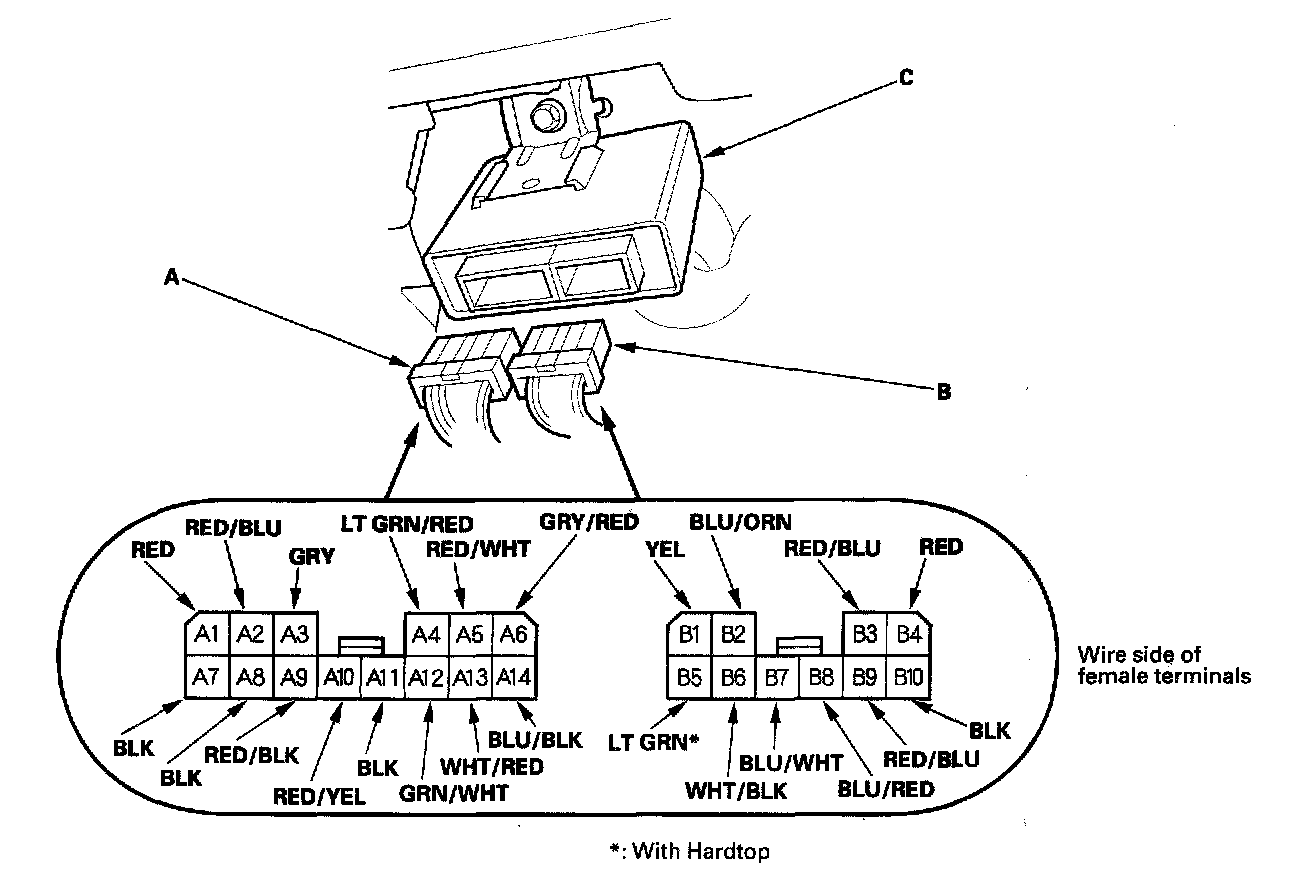 2. Disconnect the 14P connector (A) and 10P connector (B) from the convertible top control unit (C).