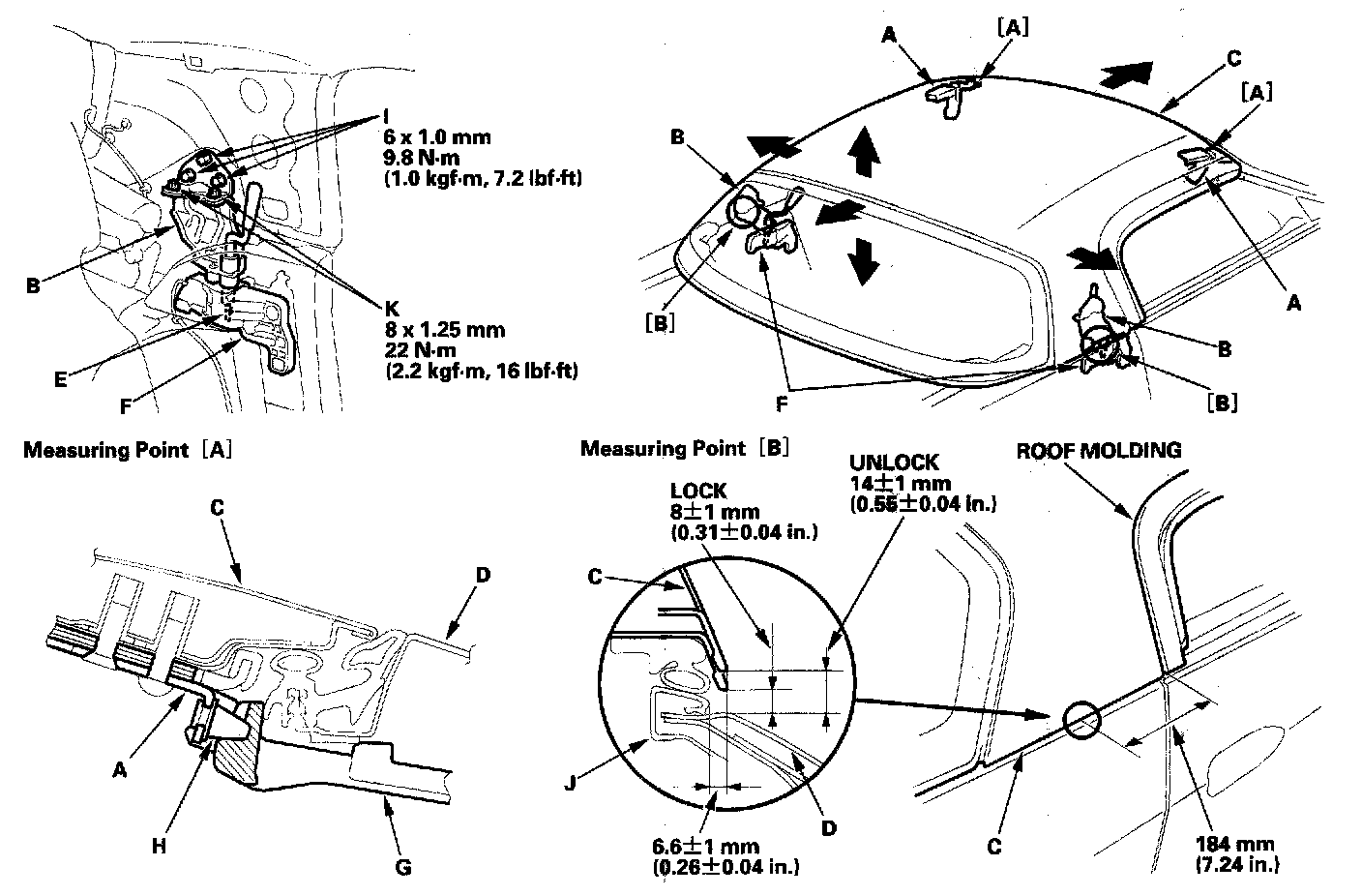 3. To adjust the horizontal clearance between both side edges of the roof and the rear tray opening molding (J) to the specification, loosen the holder plate mounting bolts (K), then move the roof to the right or left.